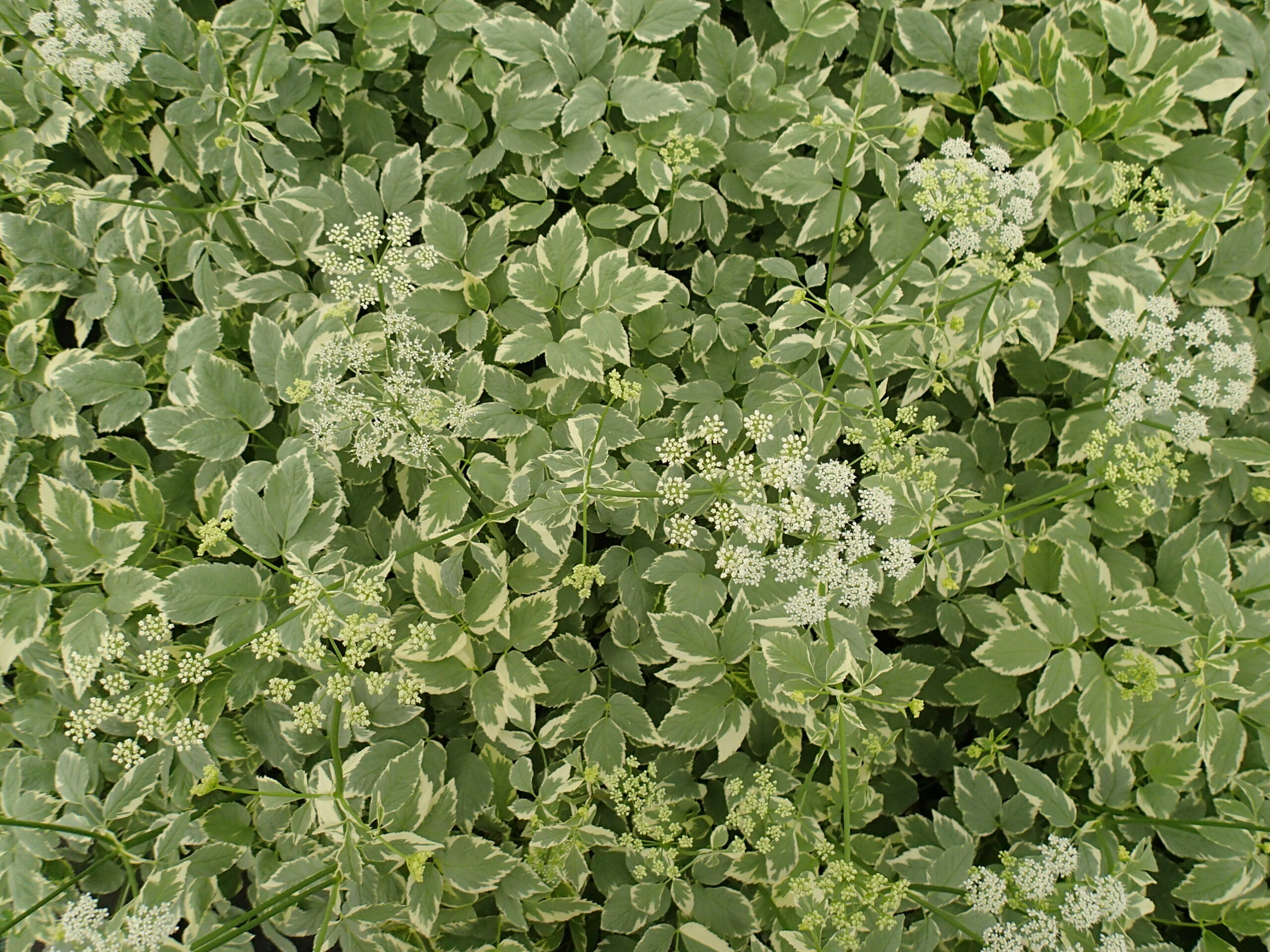 White flowers in August through September appear on a fast growing dense mat of variegated foliage. Use as a vigorous groundcover.