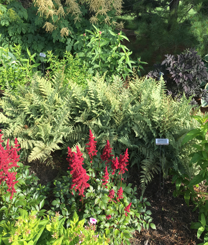 Upright growth with silver-white foliage. Happy in dry or moist soils. A cross between Lady fern and Japanese Painted fern. Especially effective when planted with adjacent dark foliage plants.