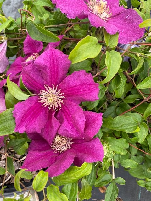 An array of beautiful flowers cover these deciduous vines from May through October. Clematis is happiest with its roots in a cool, moist, well-drained area. The varieties we have selected can be trimmed from April into early May to about 12-18″ above the ground. Separate and direct new shoots to keep them from being tangled.
