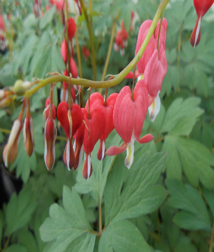 Bright red heart-shaped flowers with a white tip dangle from red stems. Foliage is a bit deeper green than the species making a great contrast of color. May go dormant in the summer. Likes rich, moist soil; use in a shade garden.