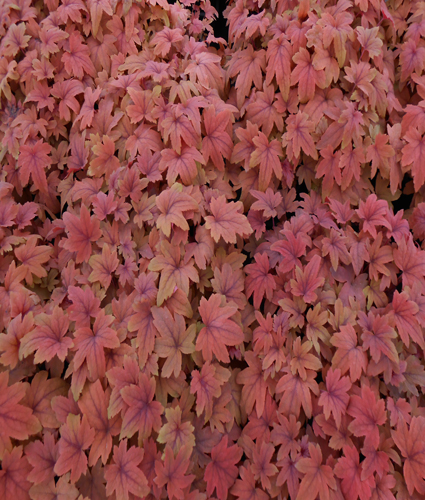 Large burnt orange leaves with cinnamon-star centers. Darker leaves appear in the summer heat and lighten up again in the fall. Big, bold habit. Blooms white.