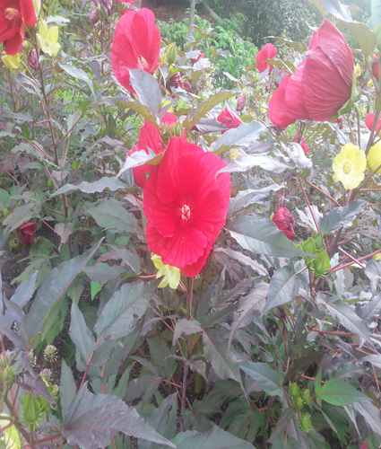 Large 8-9″ scarlet-red flowers, deep wine purple maple-cut foliage.