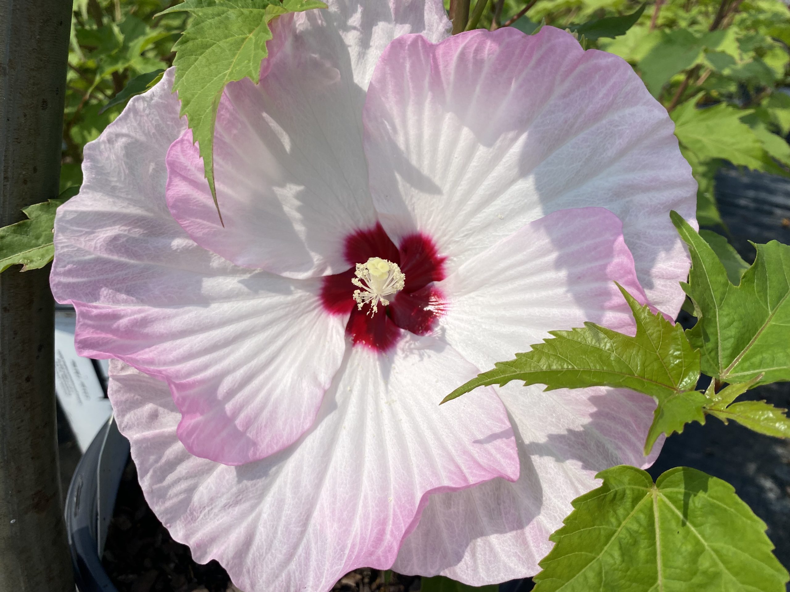 Ruffled 7” flowers are white with blush-pink edges and a deep red eye. 3-4’.