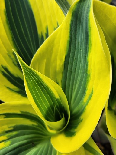 Frosty blue leaves with a bright yellow, extra-wide, margin that lightens to creamy yellow to ivory in summer. Light lavender flower scapes in mid to late summer.