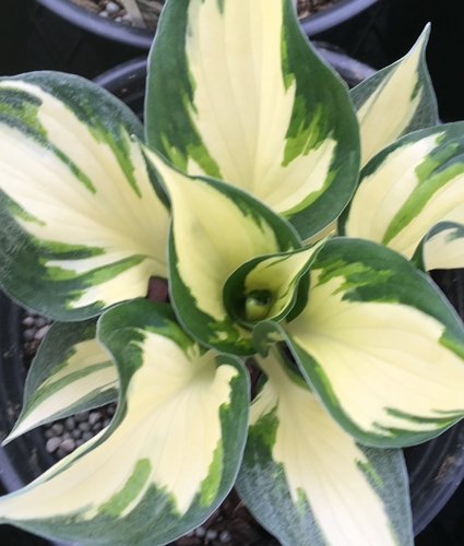 Slightly twisted green leaves with pure white center, pale lavender flowers on 24″ scapes. This well-behaved hosta is perfect for a narrow pathway. Will tolerate some sun also.
