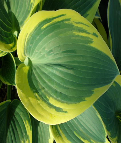 Plantain Lily height: 12-14″zone: 3habit: moundEmerges with a blue center, gradually turning dark green. Margins appear golden yellow turning to creamy white.