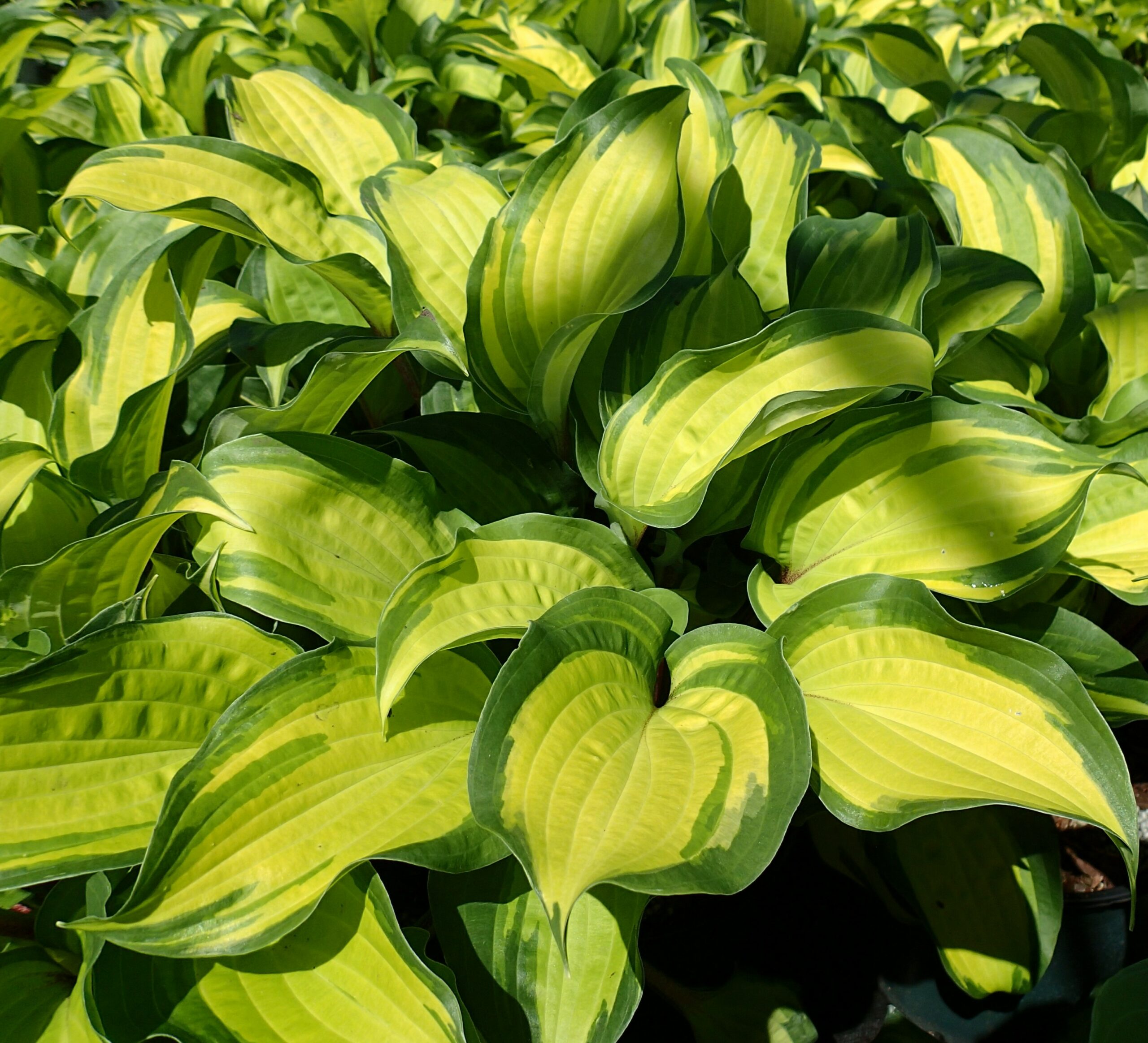 Lightly puckered leaves emerge in the spring brilliant yellow, before toning down to chartreuse in the heat of summer. Wide, deep green margins contrast nicely all season long. Showy red petioles and dark lavender flowers make this one stand out.