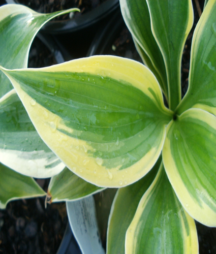 Blue-green leaves have wide, dramatically streaked, yellow margins which fade to creamy-white later in the season. Lavender flowers appear on 40″ scapes from early to midsummer. Use to brighten a dark spot.