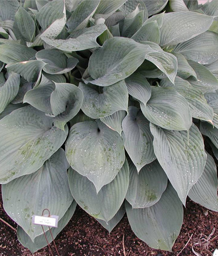 Seersucker heart-shaped blue-gray foliage with white flowers on short bloom scapes. Excellent specimen. Plants and leaves get larger each year.