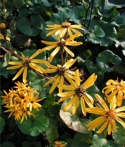 Bold purple foliage with orange daisy-like flowers. Excellent specimen requires rich, moist soil afternoon and shade. A stately perennial.