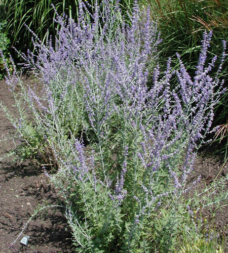 Russian Sage height: 36-48″ zone: 5 habit: loose-open Aromatic grey-green foliage with pale lavender-blue flowers in August into fall. Appearance is open and airy. Drought tolerant.