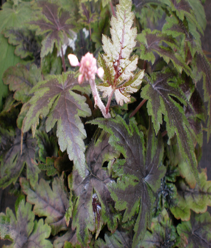 Dramatic, lacy leaves with heavily marked centers in summer and winter and lightly fragrant. Pink flowers with a white interior appear in early spring. Tiarellas prefer woodland conditions, humus-rich, moisture-retentive soil, and dappled to full shade.